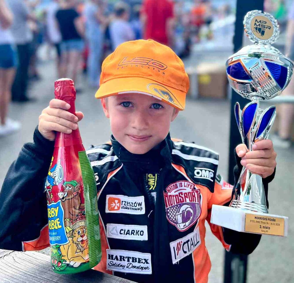 W tej kategorii jeździło 11 kierowców a wśród nich Leo Gierula. Na codzień zawodnik jeżdżący w naszym kraju w pokazach, w Moravský Pohár nie ma kłopotu z tym, by rywalizował ze swoimi równolatkami. 6-latek z Przemyśla, podopieczny Racing is Life Motorsport zajął 3 miejsce, które generalnie nie miało znaczenia, bo najważniejszy był puchar, który widać na zdjęciu: